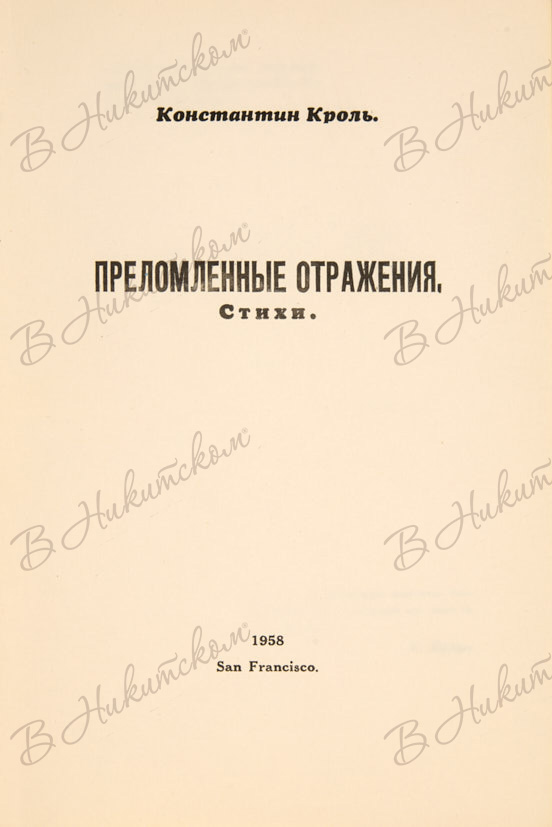Кроль, К. Переломленные отражения. Стихи. Сан-Франциско: Русская жизнь, 1958.