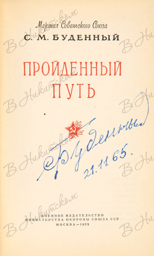 Будённый, С.М. [Автограф]. Пройденный путь. Л.: Воениздат Министерства Обороны СССР, 1959.