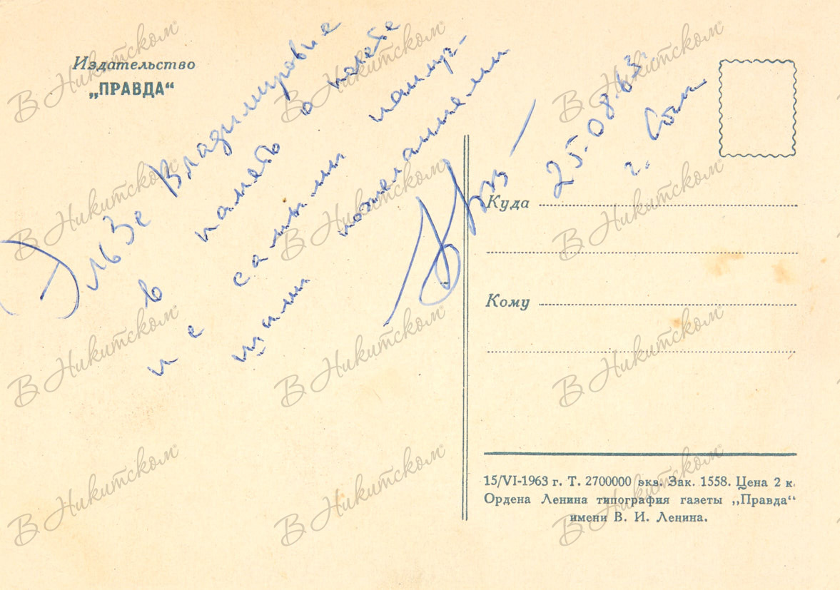 Быковский, В. [Автограф]. Открытка с автографом. 1963.