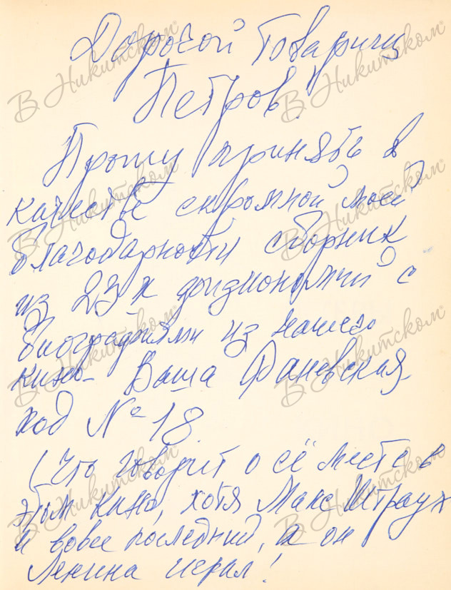 [Автограф актрисы Фаины Раневской]. Актёры советского кино. М.: «Искусство», 1964.