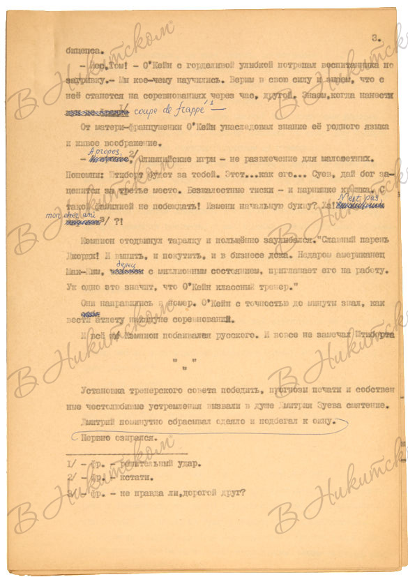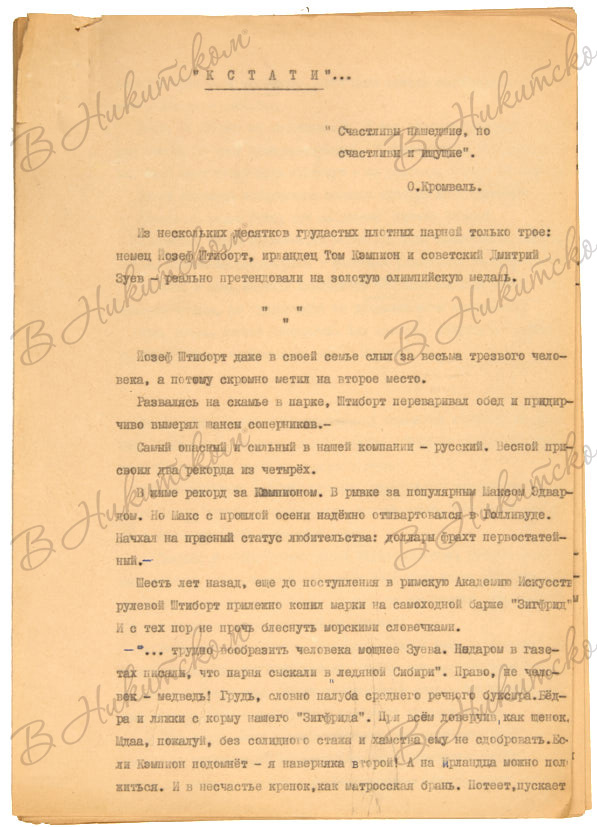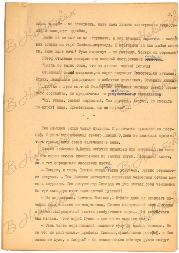 1. Власов, Ю. [Автограф]. Машинопись рассказа «Кстати...» 1965. 28 c. 30 x 21 cм. 28 машинописных страниц с авторскими правками и подписью Юрия Власова на последнем листе.