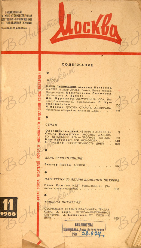 [Первая книга первой публикации романа Мастер и Маргарита]. Журнал «Москва» № 11, 1966.
