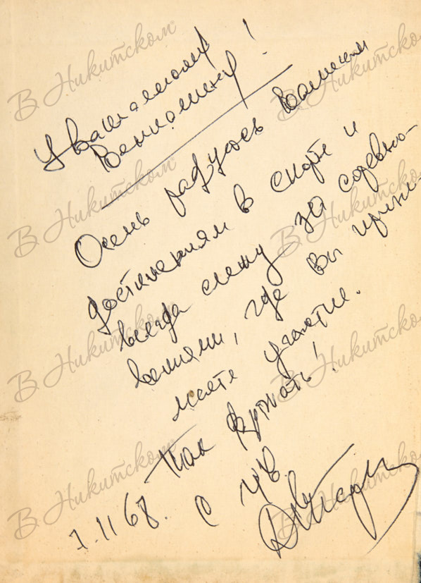 271, [1] с., ил. В иллюстрированном издательском картонажном переплете, тканевый корешок. Надломы форзацев, корешок отстает от блока. Форзац 2а, авантитул и титульный лист практически выпадают из блока. На форзаце 2а дарственная надпись: «Уважаемому Вениамину! / Очень радуюсь Вашим / достижениям в спорте и / всегда слежу за соревно-/ ваниями, где Вы прини-/ маете участие. / Так держать! / 7.11.68. / С уважением / (подпись)».