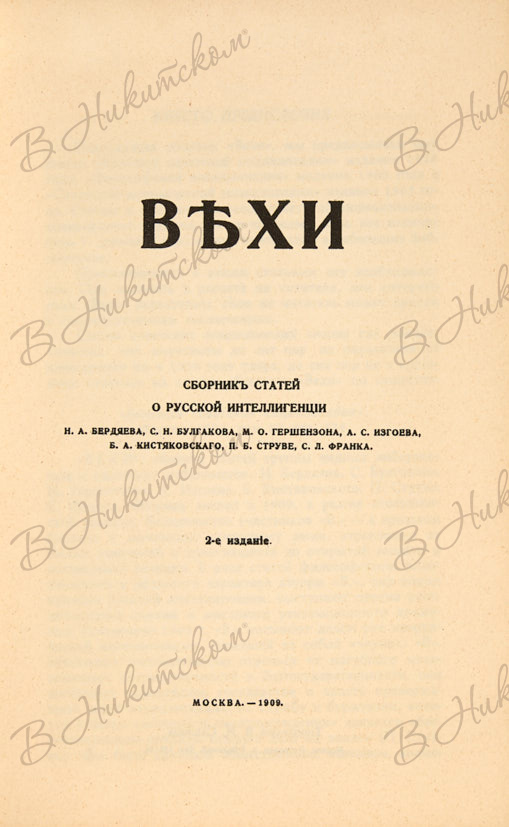 Вехи: Сборник статей о русской интеллигенции / [статьи] Н.А. Бердяева, С.Н. Булгакова, М.О. Гершензона [и др.]. 2-е изд. Frankfurt am Main: Посев, 1967.