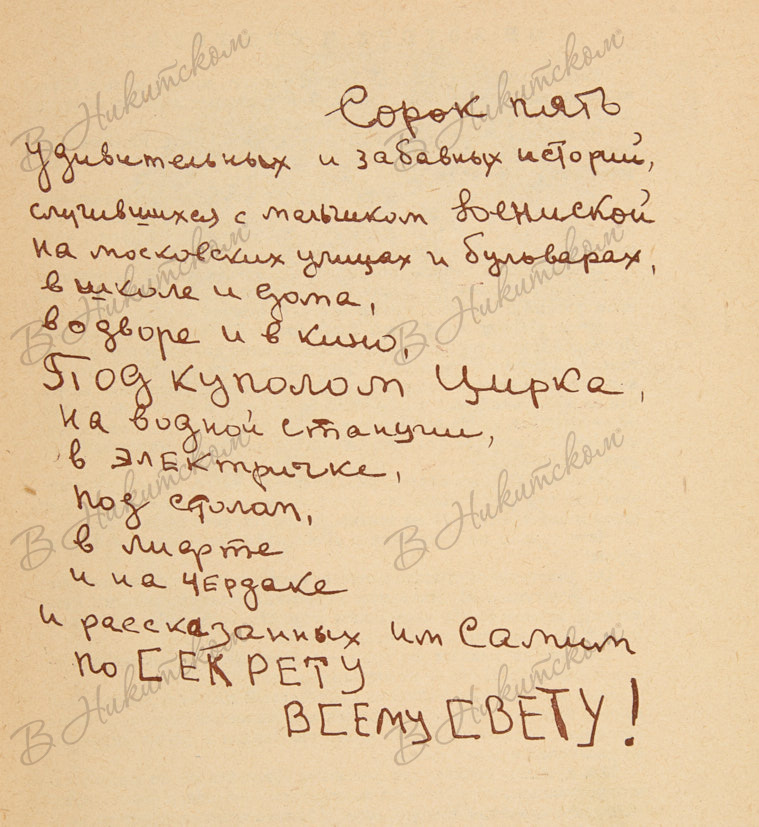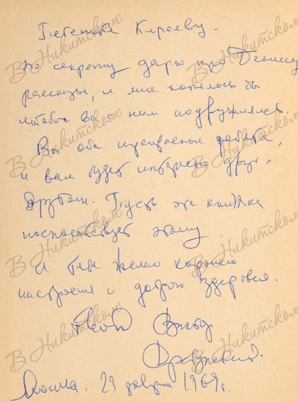 277, [3] с., ил. 22 х 17,5 см. В картонажном издательском иллюстрированном переплете, тканевый корешок. Потертости переплета, небольшие загрязнения корешка. Надломы по форзацам. На обороте форзаца 2б автограф автора: «Петеньке Кирееву. / по секрету дарю про Денису / рассказы, и мне хотелось бы / чтобы в с ним подружились. / Вы оба прекрасные ребята, /и вам будет интересно друг с / другом. Пусть эта книжка / поспособствует этому. / А тебе желаю хорошего / настроения и доброго здоровья. / Твой Виктор / Драгунский. / Москва. 23 февраля 1969 г.».