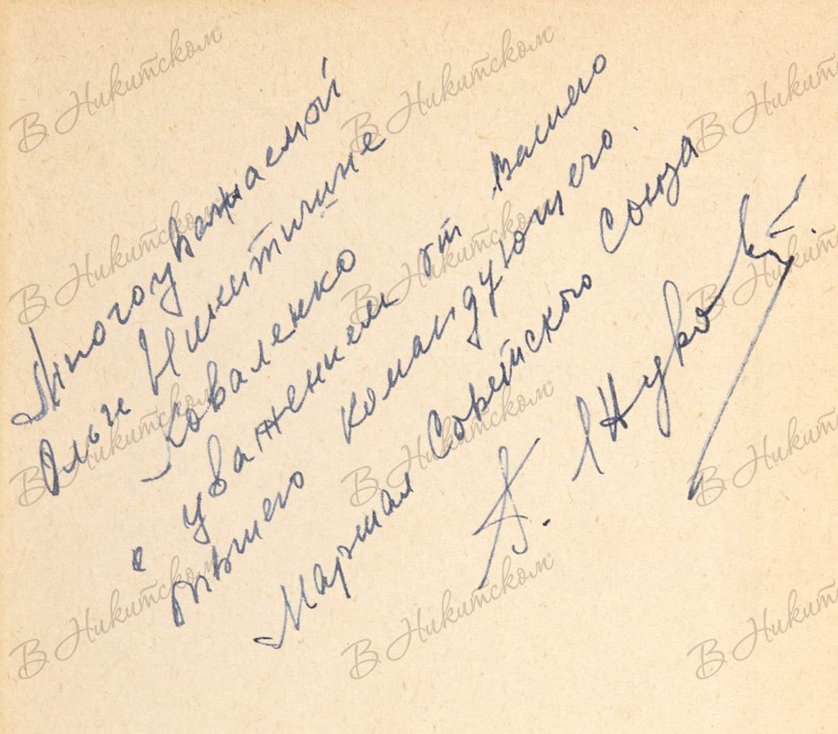 1 л. фронт., 733, [3] с., ил. 21 х 14,5 см. В коленкоровом издательском переплете. Незначительные потертости переплета. На форзаце 1а автограф маршала Жукова: «Многоуважаемой / Ольге Никитишне / Коваленко / с уважением от Вашего / бывшего командующего. / Маршал Советского Союза / Г. Жуков».