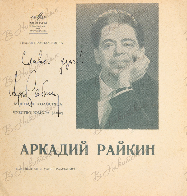 [Гибкая пластинка с автографом Аркадия Райкина]. Аркадий Райкин. Монолог холостяка. Чувство юмора. Б.м.: «Мелодия», [1970].