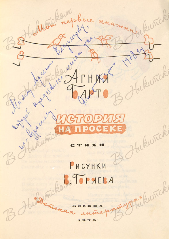 [Серия «Мои первые книжки»]. Барто, А. [Автограф]. История на просеке / рис. В. Горяева. М.: «Детская литература», 1974.