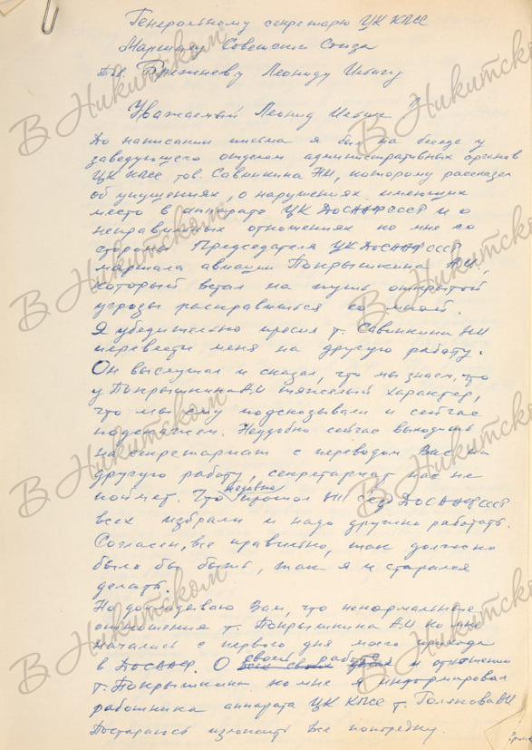 1. Черновик письма А. П. Шилина к Л.И. Брежневу об угнетении своим начальником маршалом авиации А. И. Покрышкиным. [Конец 70-х]. 30 x 21 cм.