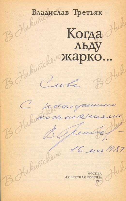 Третьяк, В. [Автограф]. Когда льду жарко. М.: «Советская Россия», 1981.
