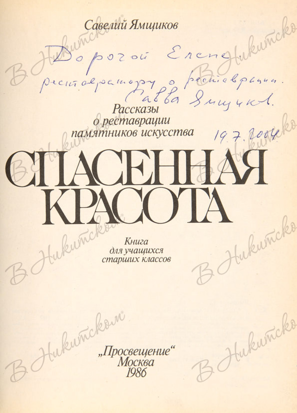 Ямщиков, С. [Автограф]. Спасённая красота. Рассказы о реставрации памятников искусства. Книга для учащихся старших классов. М.: «Просвещение», 1986.