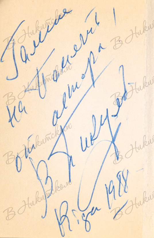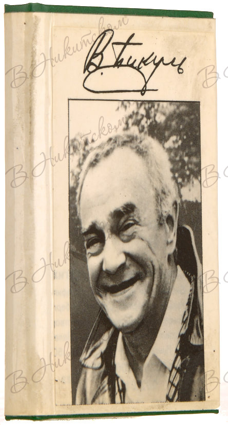 62, [2] с. 10,3 х 6,7 см. В ледериновом издательском переплете, иллюстрированная суперобложке. Корешок полностью отстает от блока. На обороте форзаца 2а автограф автора: «Галине / на память / от автора. / В. Пикуль. / Riga 1988».