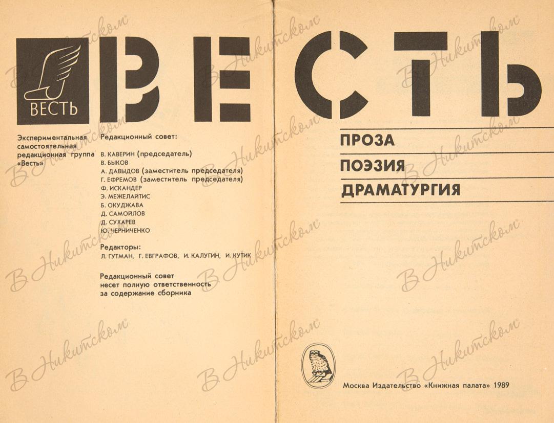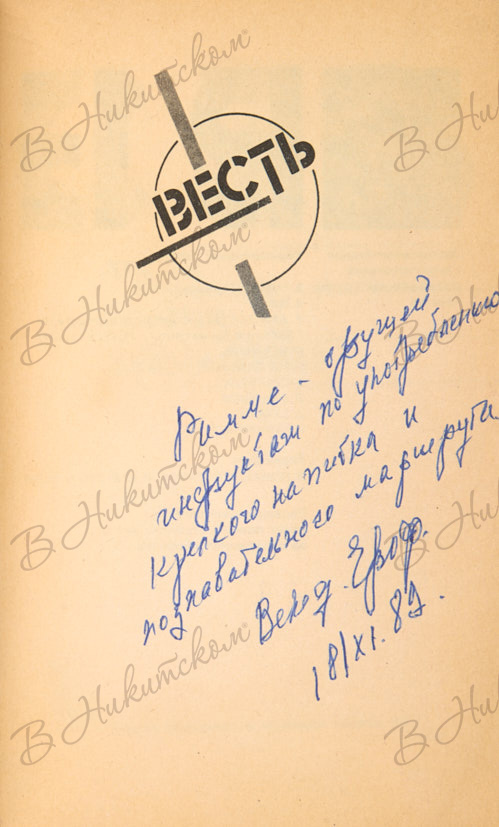 [Автограф Венедикта Ерофеева]. Весть. Проза. Поэзия. Драматургия. М.: «Книжная палата», 1989.