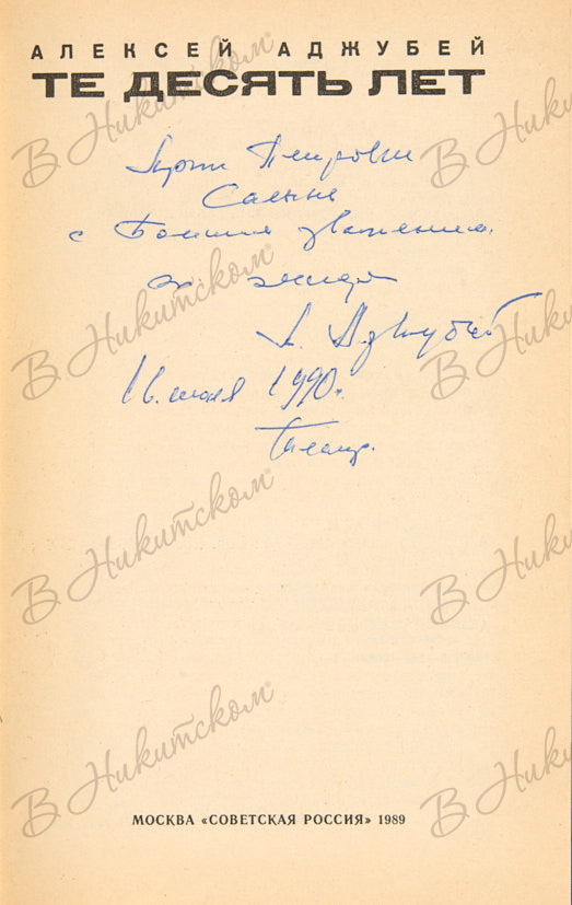 Аджубей, А. [Автограф]. Те десять лет. М.: «Советская Россия», 1989.