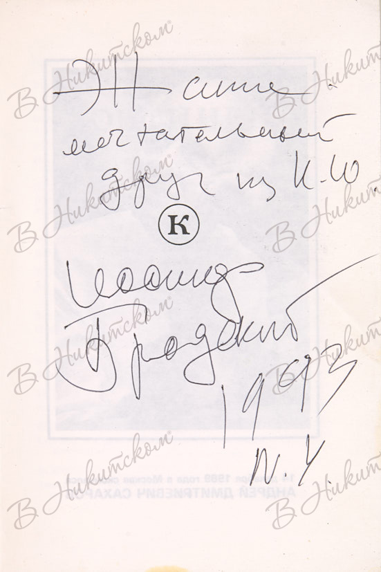 1 л. фронт. (портр.), 397, [3] с. 17,8 х 12 см. В иллюстрированной издательской обложке. Потертости, загрязнения обложки. Блок чистый. На обороте фронтисписа автограф И. Бродского: «Жанне - / мечтательный / друг из Н.Ю. / Иосиф / Бродский / 1993 / N.Y.».