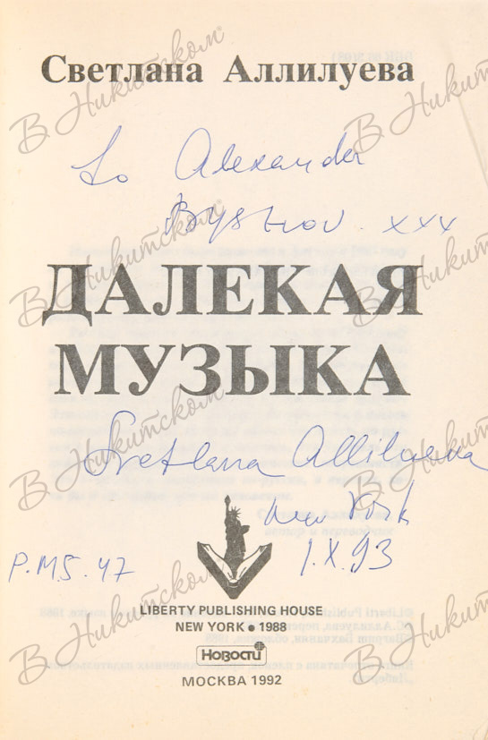 Аллилуева, С. [Автограф]. Далёкая музыка. М.: «Новости», 1992.