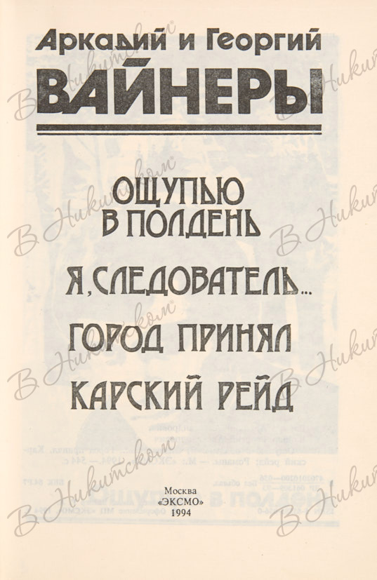 [Автограф А. Вайнера]. Аркадий и Георгий Вайнеры. Ощупью в полдень. Я следователь… Город принял. Карский рейд. М.: «ЭКСМО», 1994.