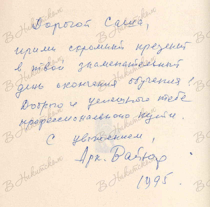 541, [3] с. 22 х 15 см. В коленкоровом издательском иллюстрированном переплете. Незначительные загрязнения переплета. В очень хорошем состоянии. На обороте первого свободного листа дарственная надпись: «Дорогой Саша, / прими скромный презент / в твой знаменательный / день окончания обучения! / Доброго и успешного тебе / профессионального пути. / С уважением, Арк. Вайнер. / 1995».