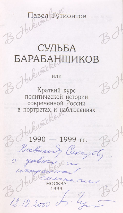Гутионтов, П. [Автограф литературоведу В. Сахарову]. Судьба барабанщиков или Краткий курс политической истории современной России в портретах и наблюдениях. 1990 – 1999 гг. М.: Проф. союз журналистов России, 1999.