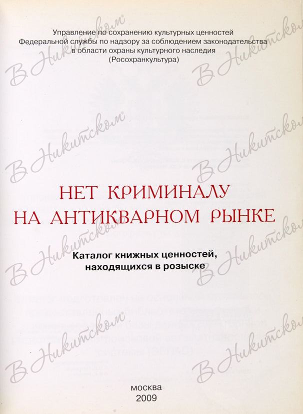 Нет криминалу на антикварном рынке. Каталог книжных ценностей, находящихся в розыске. М., 2009.