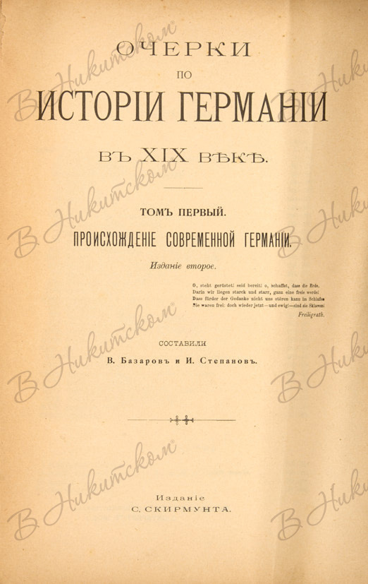 Базаров, В. Степанов, И. Очерки по истории Германии в XIX веке. Т. 1. Происхождение современной Германии. СПб.: Издание С. Скирмунта; тип. Н.П. Собко, 1906.