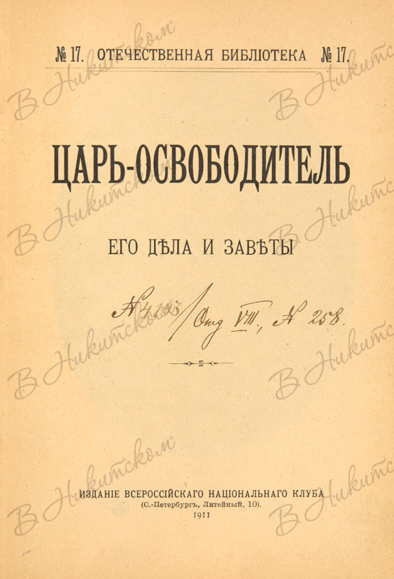 [Серия «Отечественная библиотека»] Царь-Освободитель. Его дела и заветы. СПб.: Издание Всероссийского Национального Клуба, 1911.