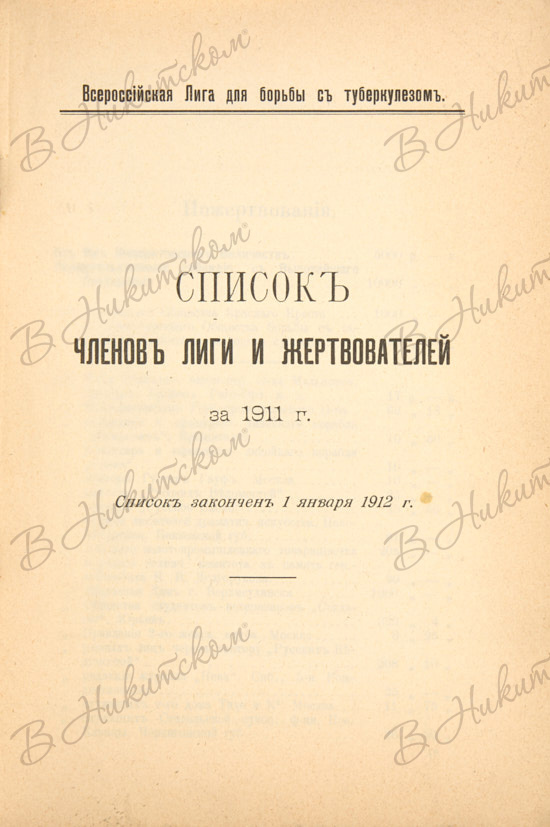 Всероссийская Лига для борьбы с туберкулёзом. Список членов лиги и жертвователей за 1911 г. Список закончен 1 января 1912 г. М.: Т-во «Печатня С.П. Яковлева», 1912.