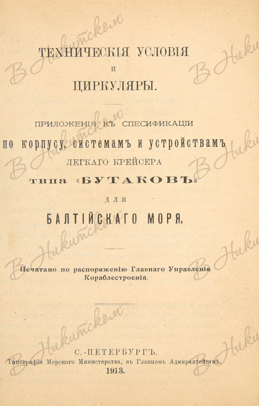 Технические условия и циркуляры. Приложения к спецификации по корпусу, системам и устройствам лёгкого крейсера типа «Бутаков» для Балтийского моря / Печатано по распоряжению Главного Управления Кораблестроения. СПб.: Типография Морского Министерства, 1913.