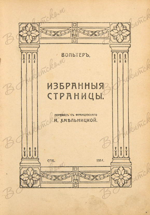 Вольтер, Ф.М. Избранные страницы / пер. с французского Н. Хмельницкой. СПб : Тип. Акц. общ. тип. дела в СПб, 1914.