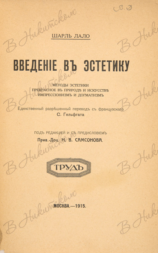 Лало, Ш. Введение в эстетику. Методы эстетики. Прекрасное в природе и искусстве. Импрессионизм и догматизм / авторизованный перевод с франц. С. Гельфгата; под ред. и с пред. Прив.-доц. Н.В. Самсонова. М.: «Труд», 1915.