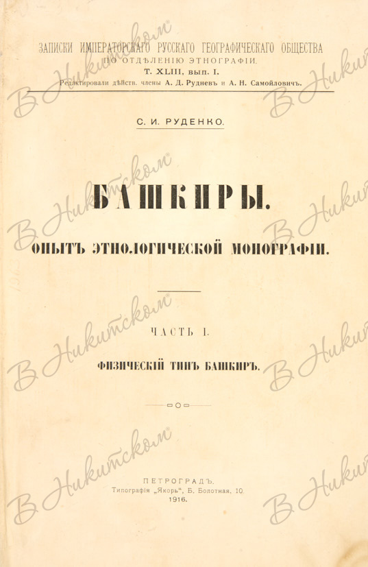 Сергей Иванович Руденко (1885–1969) – археолог, антрополог, этнолог, гидролог. Магистр географии (1917), доктор технических наук (1944), действительный член Русского географического общества (1911), член Парижского антропологического общества. В 1916 году в Петрограде была издана монография С.И. Руденко «Башкиры. Опыт этнологической монографии. Ч. 1. Физический тип башкир». Она написана на основе полевых антропологических исследований. Вторая часть монографии была написана одновременно с первой. Но политические события 1917 года и Гражданская война, естественно, задержали издание книги, поэтому она была опубликована только в 1925 году.
