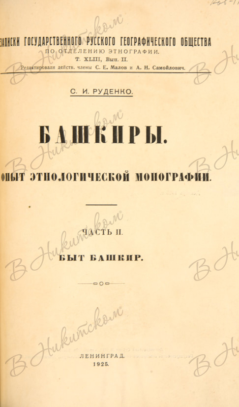 Руденко, С.И. Башкиры. Опыт этнологической монографии. (Записки Императорского Русского географического общества по отделению этнографии. Т. XLIII). В 2 ч. Ч. 1-2. Пг.: Типография «Якорь», 1916-1925.