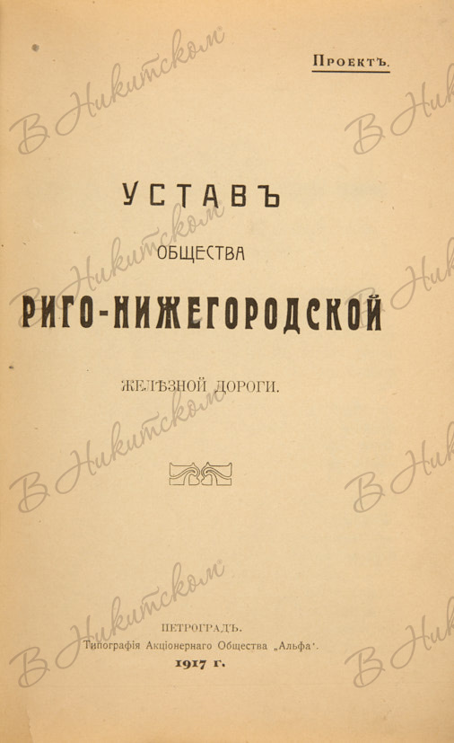 Устав Общества Риго-Нижегородской железной дороги. Пг.: Типография Акционерного Общества «Альфа», 1917.