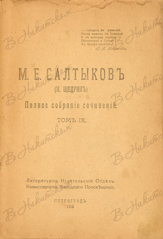 Салтыков, М.Е. (Н. Щедрин). Полное собрание сочинений. [В 12 т.]. Т. 9. Пг.: Литературно-издательский отдел Комиссариата Народного Просвещения, 1918.