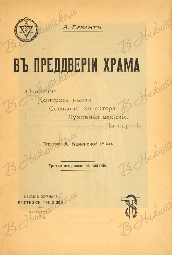 Безант, А. В преддверии храма / перевод А. Каменской. 3-е исправл. изд. Пг.: Издание журнала «Вестник теософии», 1918.