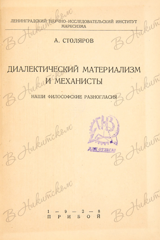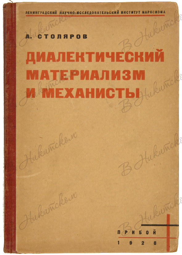 2. Столяров, А. Диалектический материализм и механисты. Л.: «Прибой», 1928. 231, [1] с. 19,9 х 13,7 см. В картонажном издательском переплете, тканевый корешок. Деформация блока. На титульном листе штамп: Для отзыва. Тираж 4000 экз.