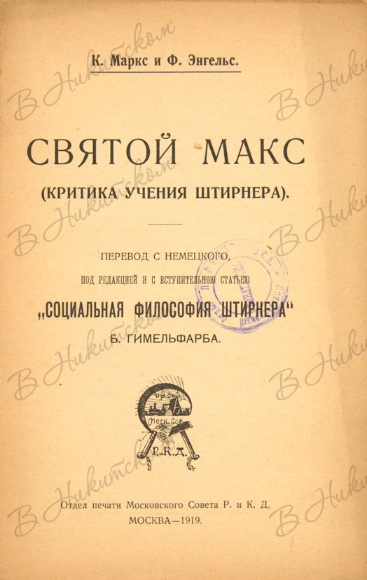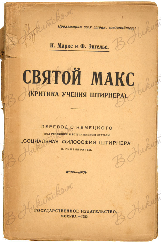 1. Маркс, К. Энгельс, Ф. Святой Макс. (Критика учения Штирнера) / перевод с немецкого под редакцией и вступ. стат. «Социальная философия Штирнера» Б. Гимельфарба. М.: Государственное издательство, 1920. 254, [4] с. 23 х 14,5 см. В шрифтовой издательской обложке. Обложка отделена от блока и распадается на две части. Фрагмент корешка сохранен. Блок распадается.