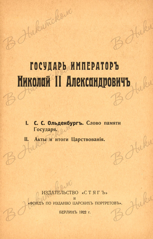 Государь император Николай II Александрович. [В 2 ч.]. Ч. 1. С.С. Ольденбург. Слово памяти Государя. Ч. 2. Акты и итоги Царствования. Берлин: Издательств «Стяг» и «Фонд по изданию царских портретов», 1922.