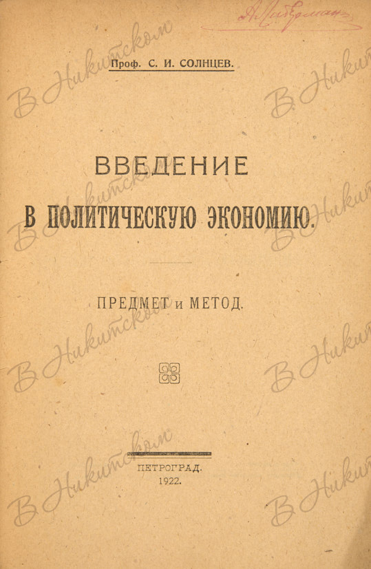 Проф. Солнцев, С.И. Введение в политическую экономию / Предмет и метод. Пг.: Издательство «Мысль», 1923.