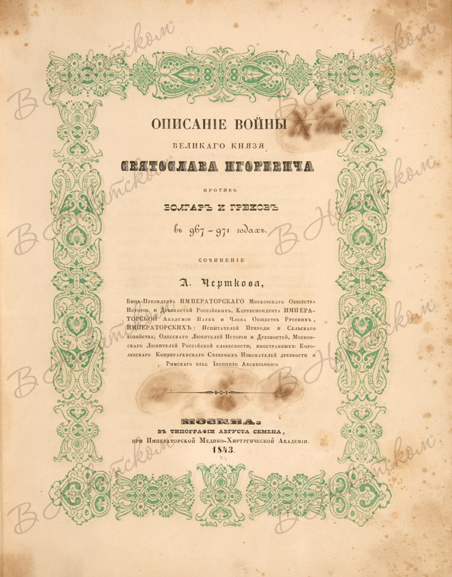 Чертков, А.Д. Описание войны великого князя Святослава Игоревича против болгар и греков в 967-971 годах. М.: Тип. Августа Семена при Имп. Медико-хирургической академии, 1843.