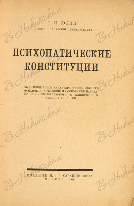 Проф. Юдин Т.И. Психопатические конституции. М.: Издание М. и С. Сабашниковых, 1926.