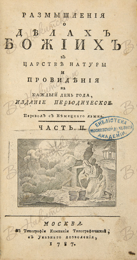 Размышления о делах божиих в царстве натуры и провидения на каждый день года. Издание периодическое / пер. с нем. яз. [В 4 ч.] Ч. 2. М.: Тип. Комп. типографич., 1787.