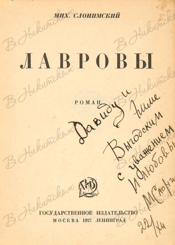 Слонимский, М. [Автограф литературоведу и переводчику Д.И. Выгодскому и его жене]. Лавровы. Роман. М.; Л.: Государственное издательство, 1927.