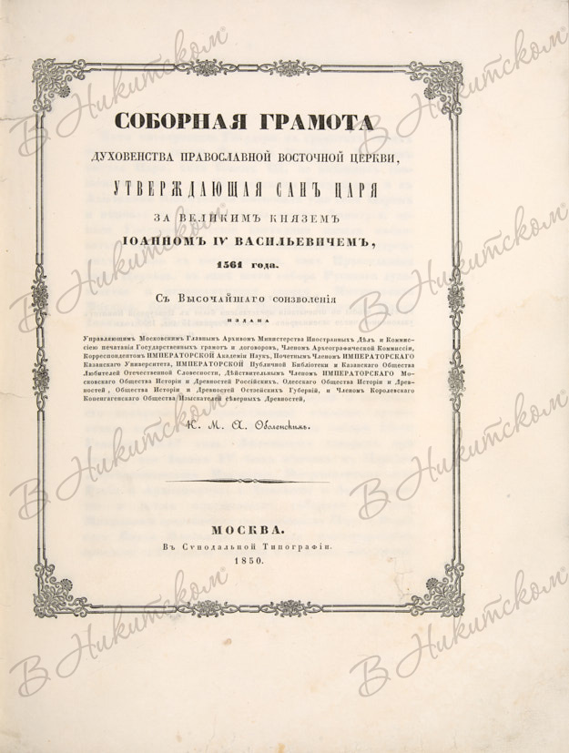 Соборная грамота духовенства православной восточной церкви, утверждающая сан царя за великим князем Иоанном IV Васильевичем 1561 года / изд. к. М.А. Оболенским. М.: Синодальная тип., 1850.