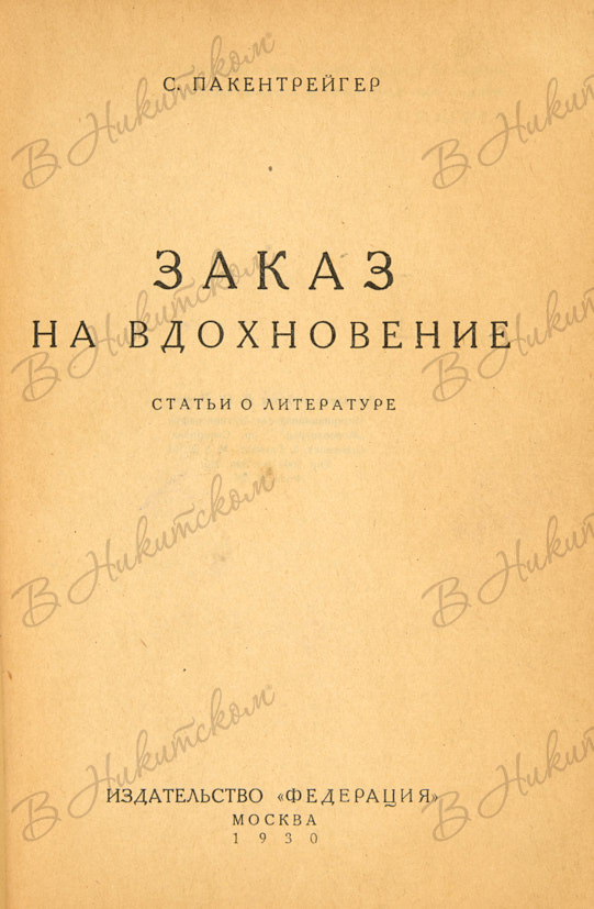 [Переплёт худ. В. Роскина]. Пакентрейгер, С. Заказ на вдохновение. Статьи о литературе. М.: Издательство «Федерация», 1930.