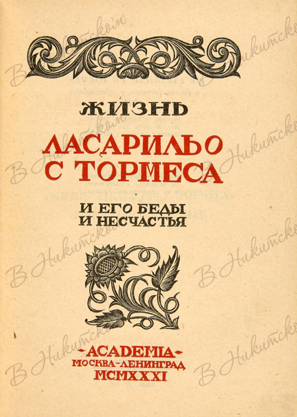 Жизнь Ласарильо с Тормеса и его беды и несчастья. М.; Л.: Academia, 1931.
