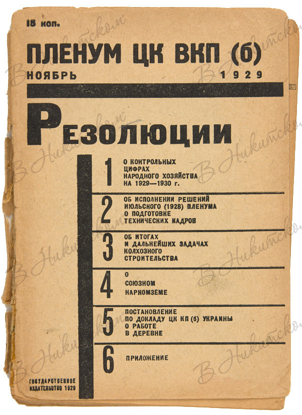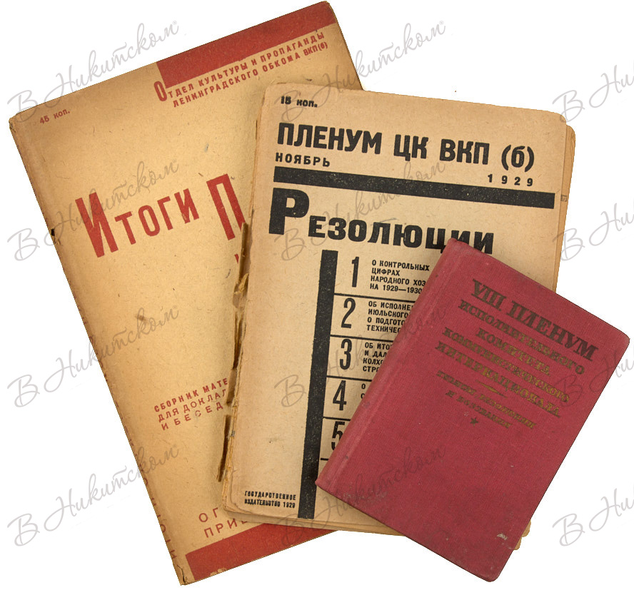 2. Пленум. Ноябрь. Резолюции. 1929. М.; Л.: Государственное издательство, 1929. 95, [1] с., ил. 16,5 х 11,5 см. В шрифтовой издательской обложке. Обложка отделена от блока и распадается на две части.