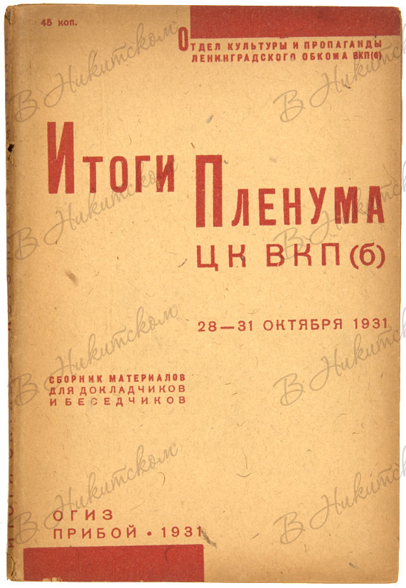 3. Итоги пленума ЦК ВКП (б) 28 – 31 октября 1931. Сборник материалов для докладчиков и беседчиков. Л.: ОГИЗ; Прибой, 1931. 95, [1] с. 19,3 х 13 см. В шрифтовой издательской обложке. Незначительные надрывы корешка. В очень хорошем состоянии.