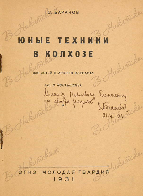 [С автографом В. Конашевича]. Баранов, С.С. Юные техники в колхозе / рис. В. Конашевича. М.: ОГИЗ; Молодая гвардия, 1931.