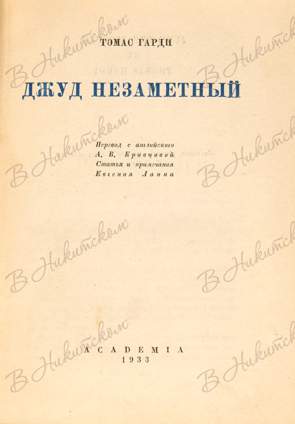 Гарди, Т. Джуд незаметный / пер. с англ. А.В. Кривцовой, статья и прим. Е. Ланна, оформ. П. Пастухова. М.; Л.: Academia, 1933.